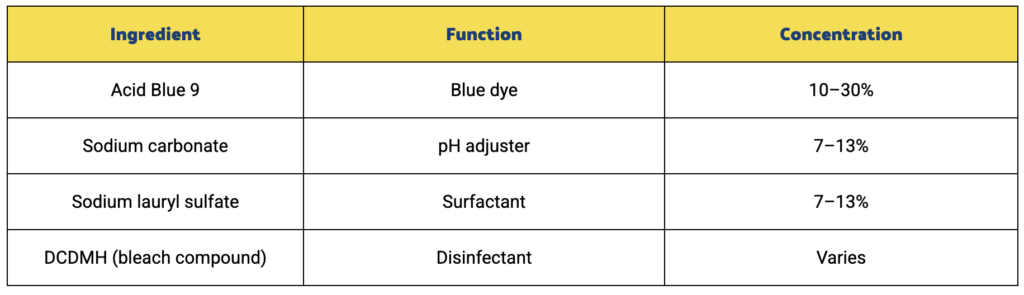 According to manufacturer Safety Data Sheets (SDS), these tablets contain 10–30% Acid Blue 9 (CAS 3844-45-9), alongside sodium lauryl sulfate and DCDMH bleach compounds.