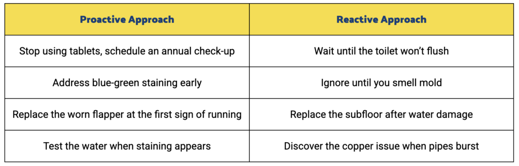 - If removing tablets and cleaning the tank don’t solve the problem—or if you see blue-green staining at multiple fixtures—call Beehive Plumbing for an inspection before hidden damage compounds.
