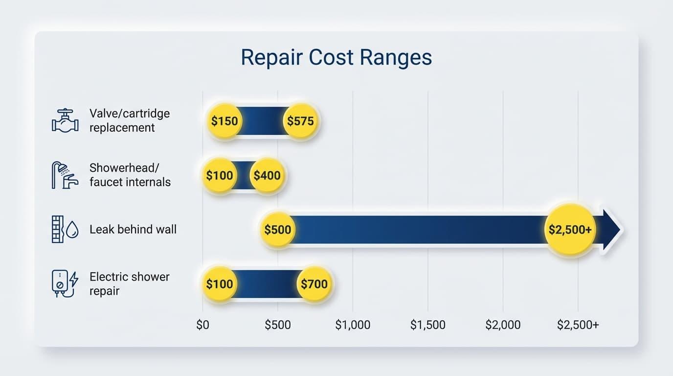 - Most fixes cost between $150 and $575 for a valve or cartridge replacement, but delaying the repair can push costs to $500–$2,500+ once water damage enters the picture.